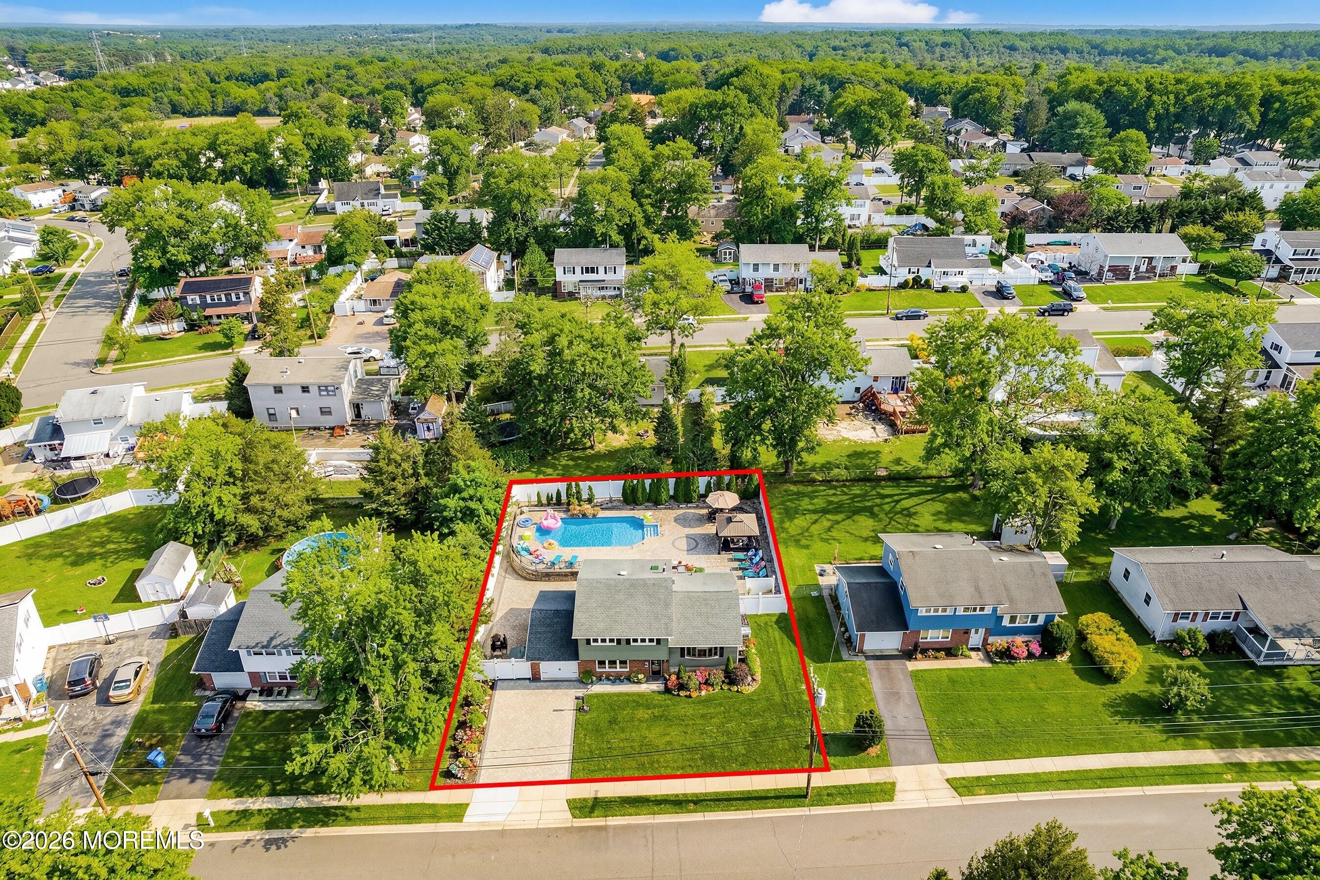 Upstairs, you’ll find spacious bedrooms with ample closet space, while the lower level offers additional living flexibility–perfect for a den, home office, or guest space. The real showstopper is the backyard oasis. Enjoy your own private retreat with a gorgeous in-ground pool, expansive paver patio, and plenty of room to relax or host. Whether it’s summer gatherings or quiet evenings, this outdoor space is designed to impress.