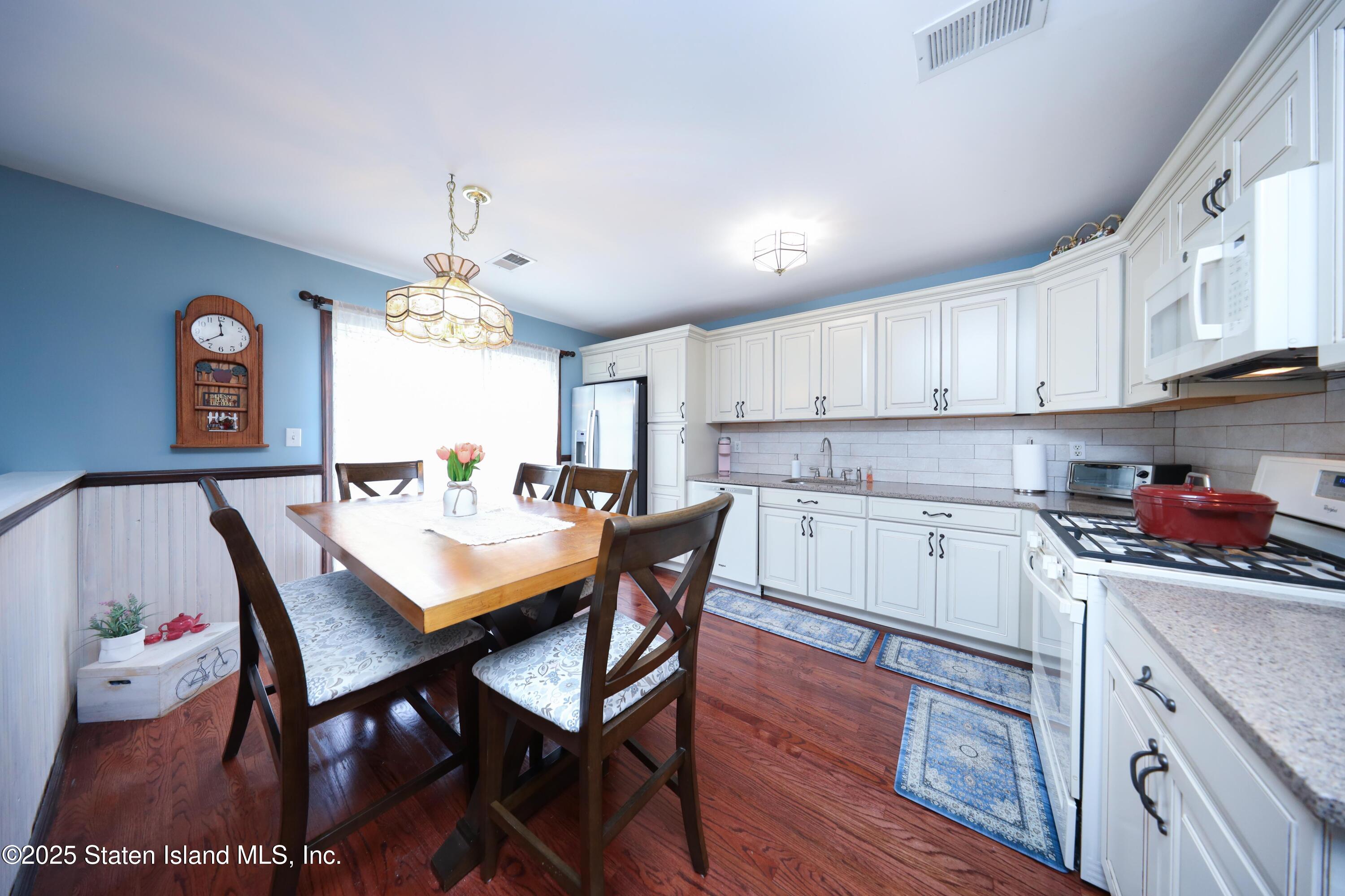 Step inside to find a bright, open-concept living and dining area, filled with natural light and accented by gleaming hardwood floors. The eat-in kitchen is tastefully renovated with long countertops, breakfast table and plenty of cabinet space, with sliding doors that lead to a private backyard patio — ideal for relaxing or entertaining.