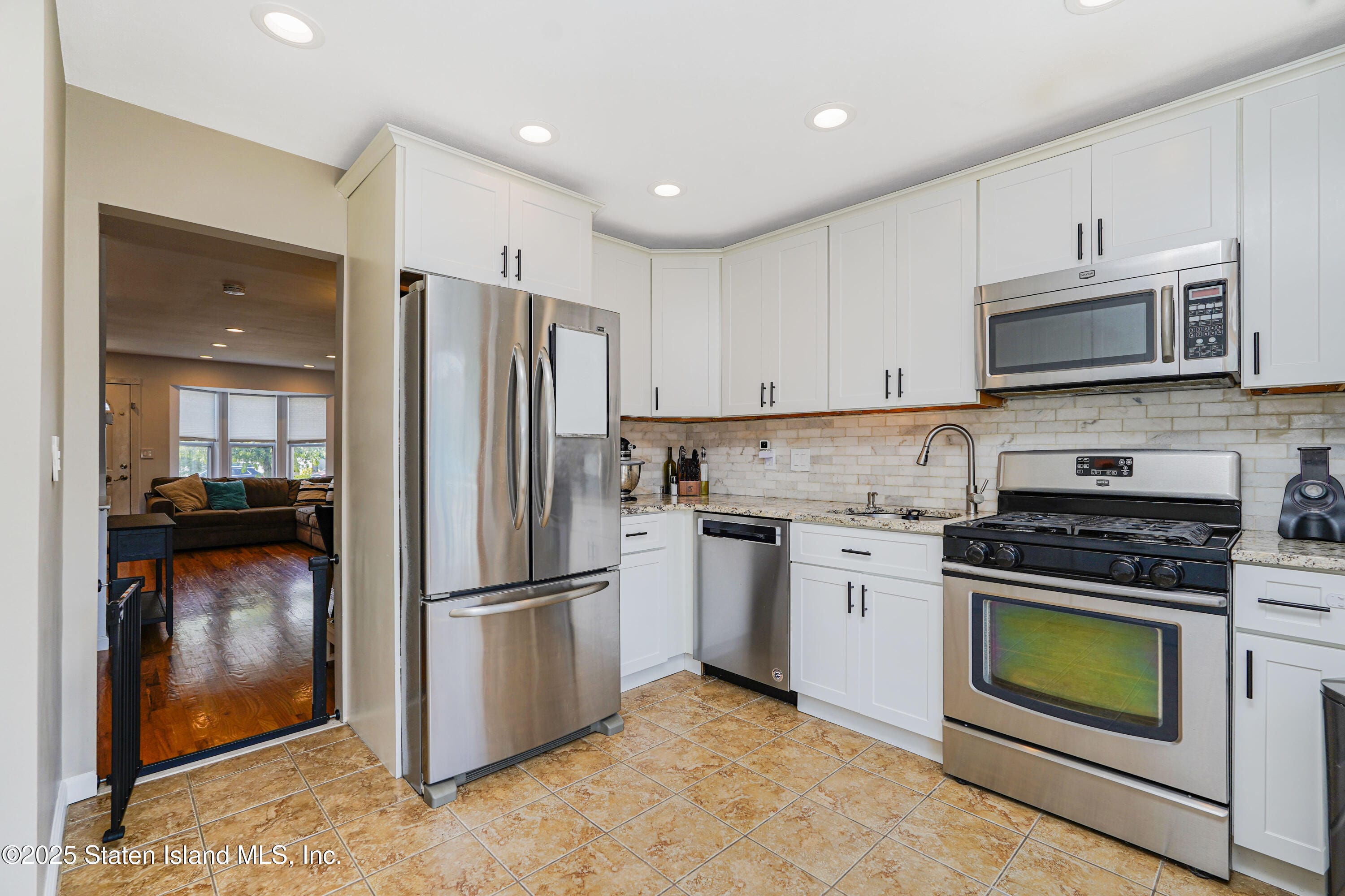 Step inside to a bright and inviting living room and dining room combination featuring gleaming hardwood floors. The updated kitchen boasts classic white shaker cabinets, granite countertops, Ss Appliances and a clean, modern design.